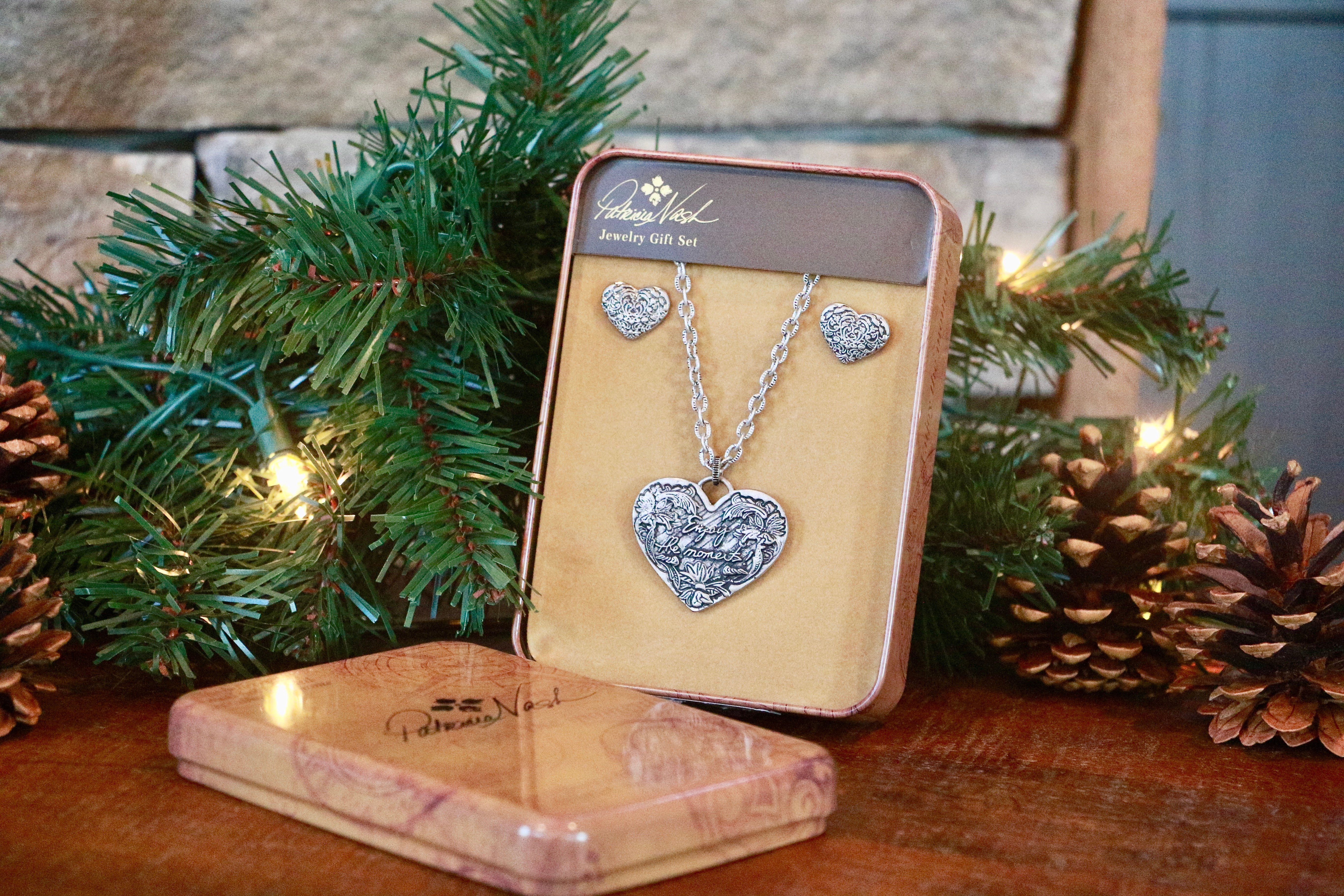 Many of Patricia's vintage-inspired handbags feature our beautiful floral tooling, and it was important to her to have this iconic tooling featured in a jewelry collection. The Tooled Floral Heart Gift Set features a long heart pendant and matching stud earrings.