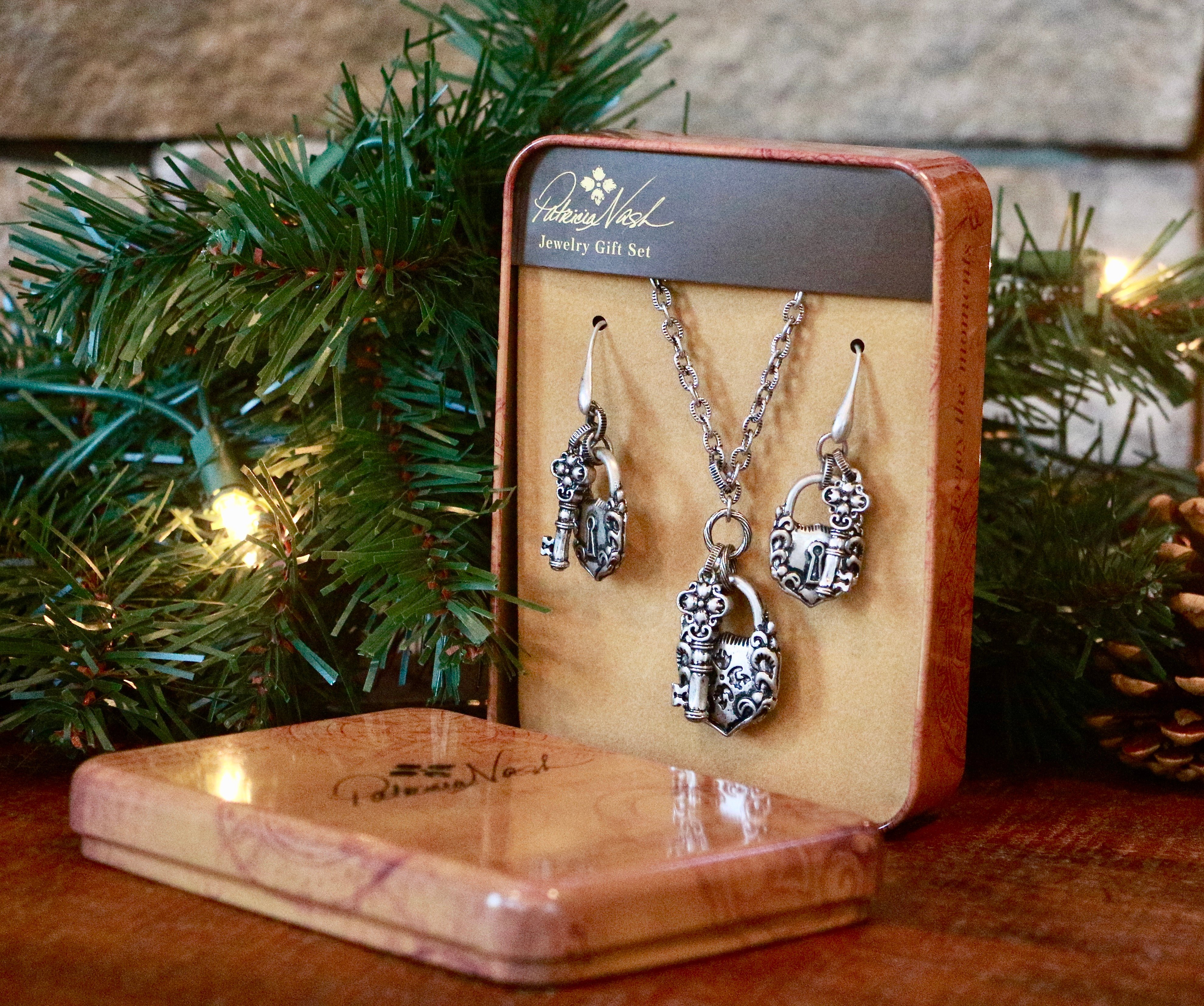 Many of Patricia's vintage-inspired handbags feature a lock and key, and it was important to her to have these iconic symbols featured in a jewelry collection. The Lock and Key Gift Set features a long, lock and key pendant with matching earrings that feature our signature floret logo.