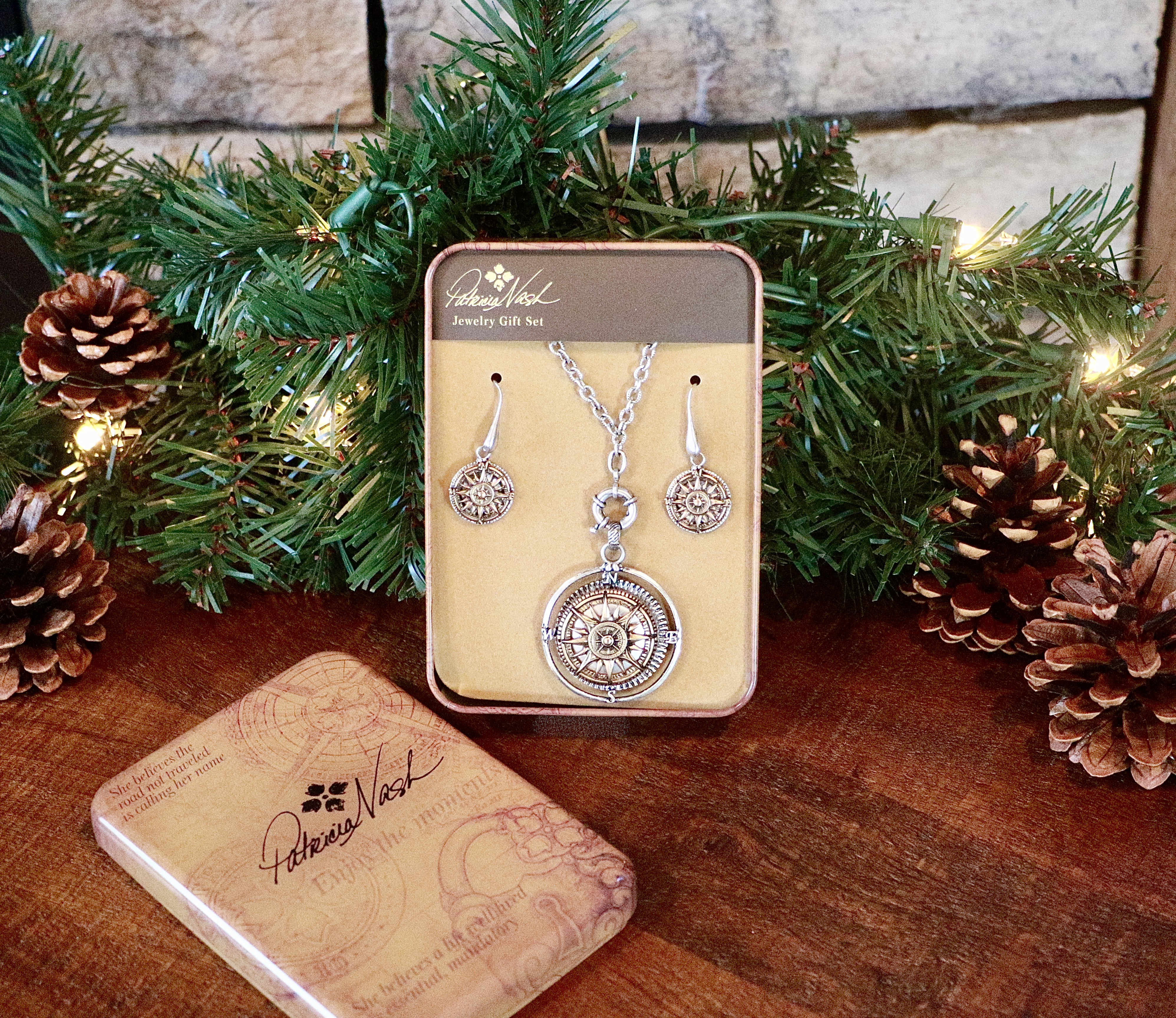 With a direct influence from our Signature Map Print, there is no more iconic piece than a compass to capture the feeling of travel. The World Compass Gift Set features a long, mixed metal compass pendant and matching drop earrings.