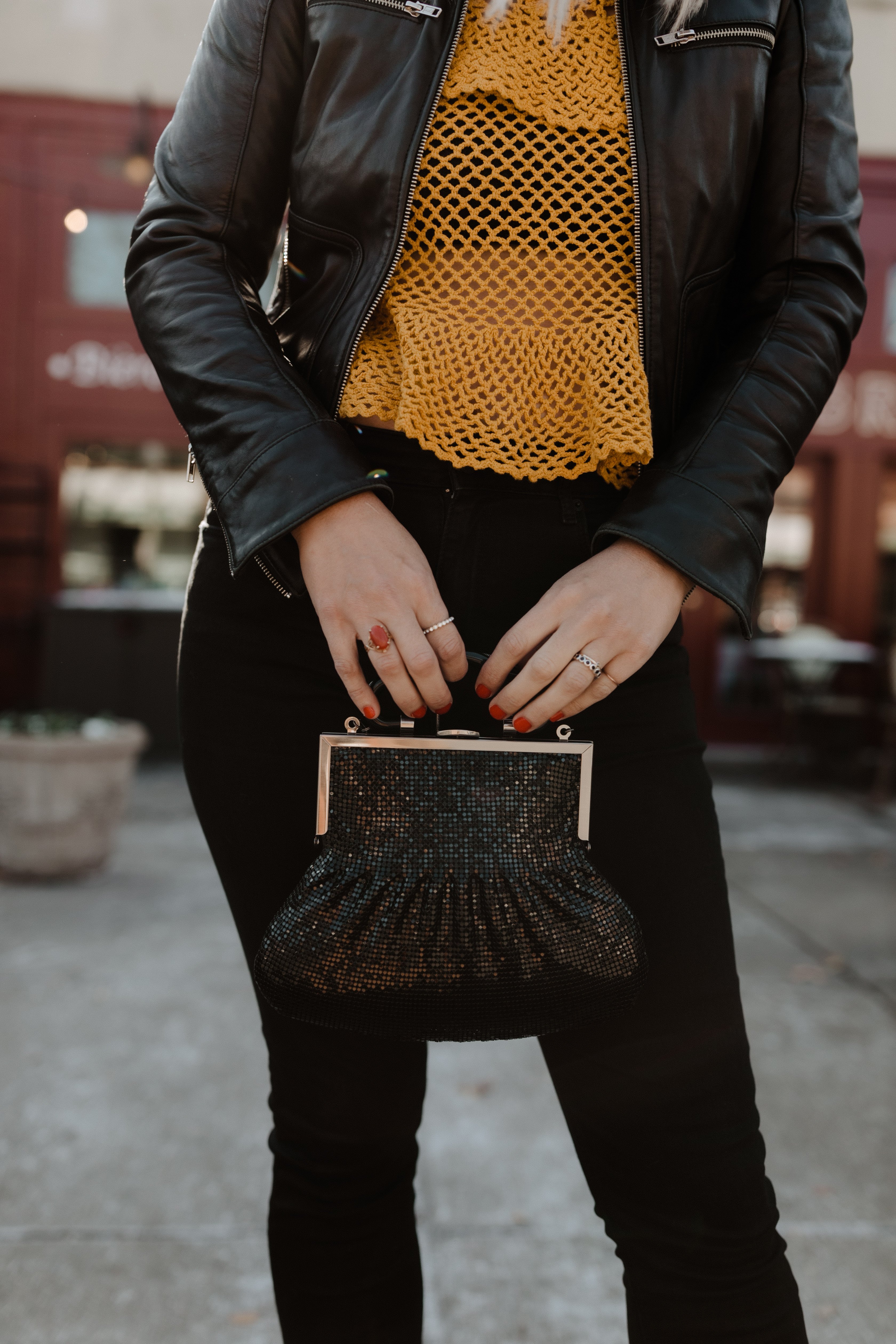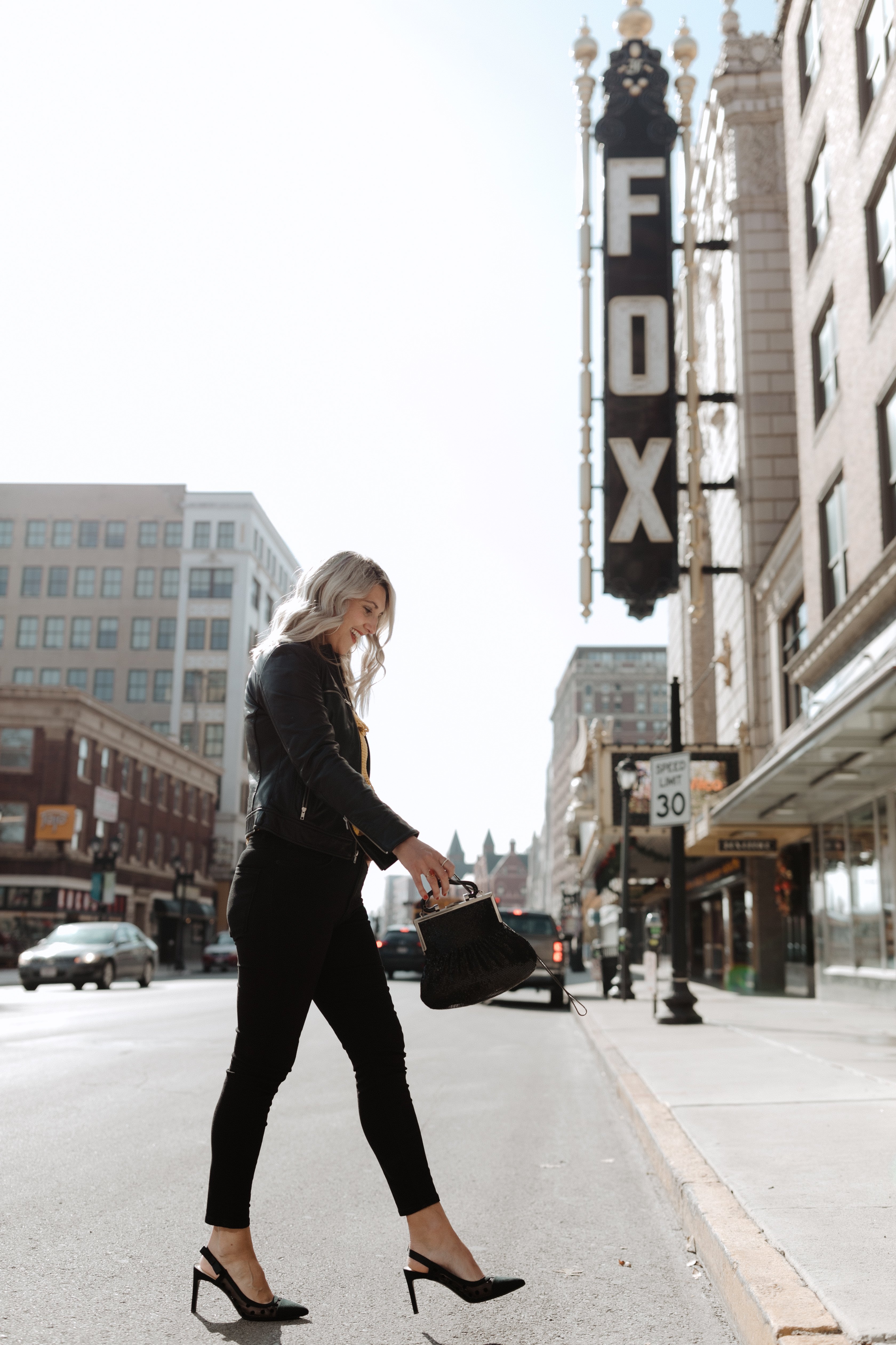 "One of the things I love about my city is all the amazing things to do around the holidays! I will definitely be wearing this darling little Alamarza Mesh bag to dinner at Brasserie and then a show at the Fox Theater".