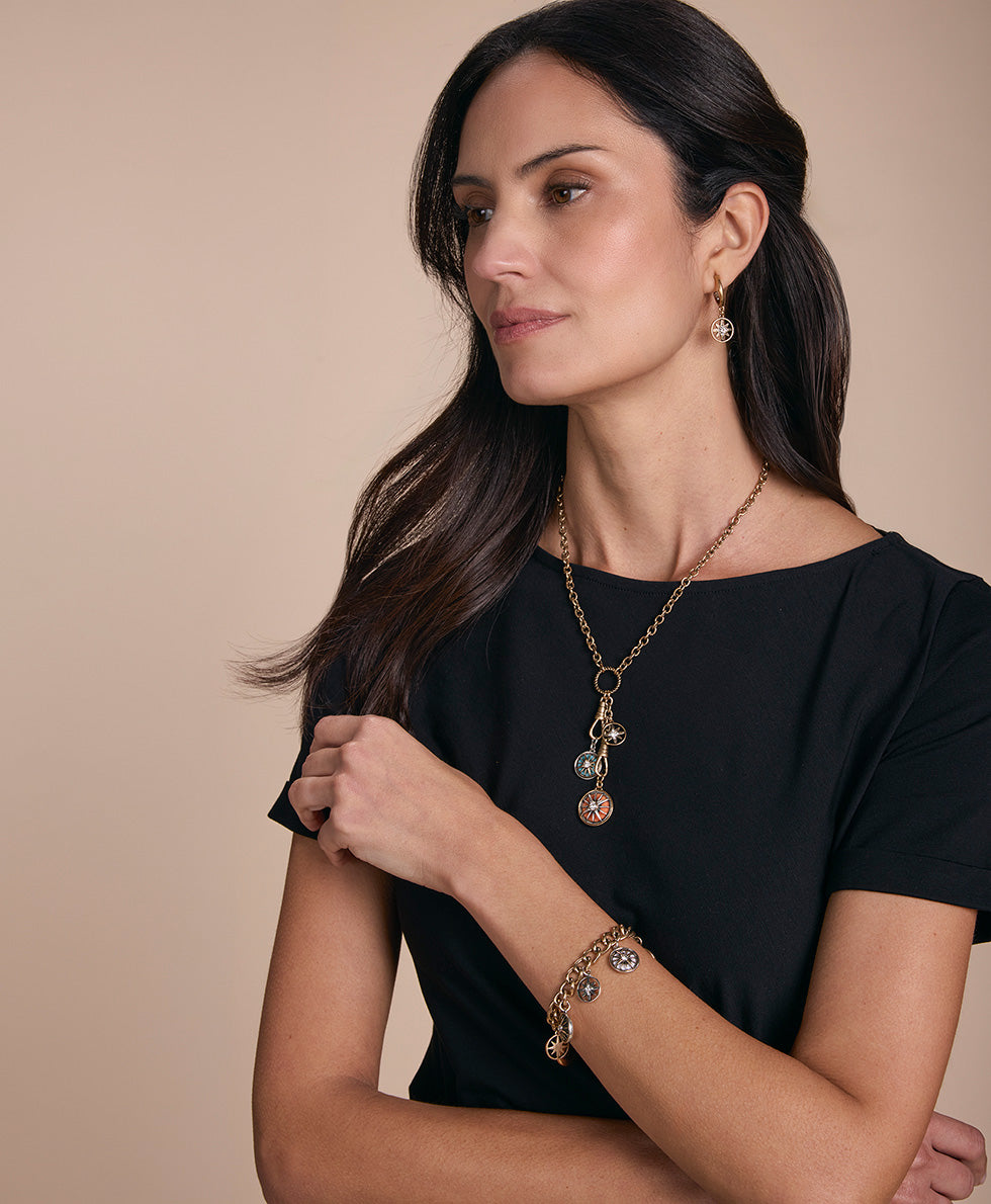 Current price: $44.00Color | AntiqueGold/Antique SilverView Full DetailsCapturing the intricate details of compasses sketched on vintage maps, this single chain bracelet with its compass charms evokes the feeling of travel. Featuring our signature metal hardware and multi-colored medallions, this bracelet is the focal point of any look.