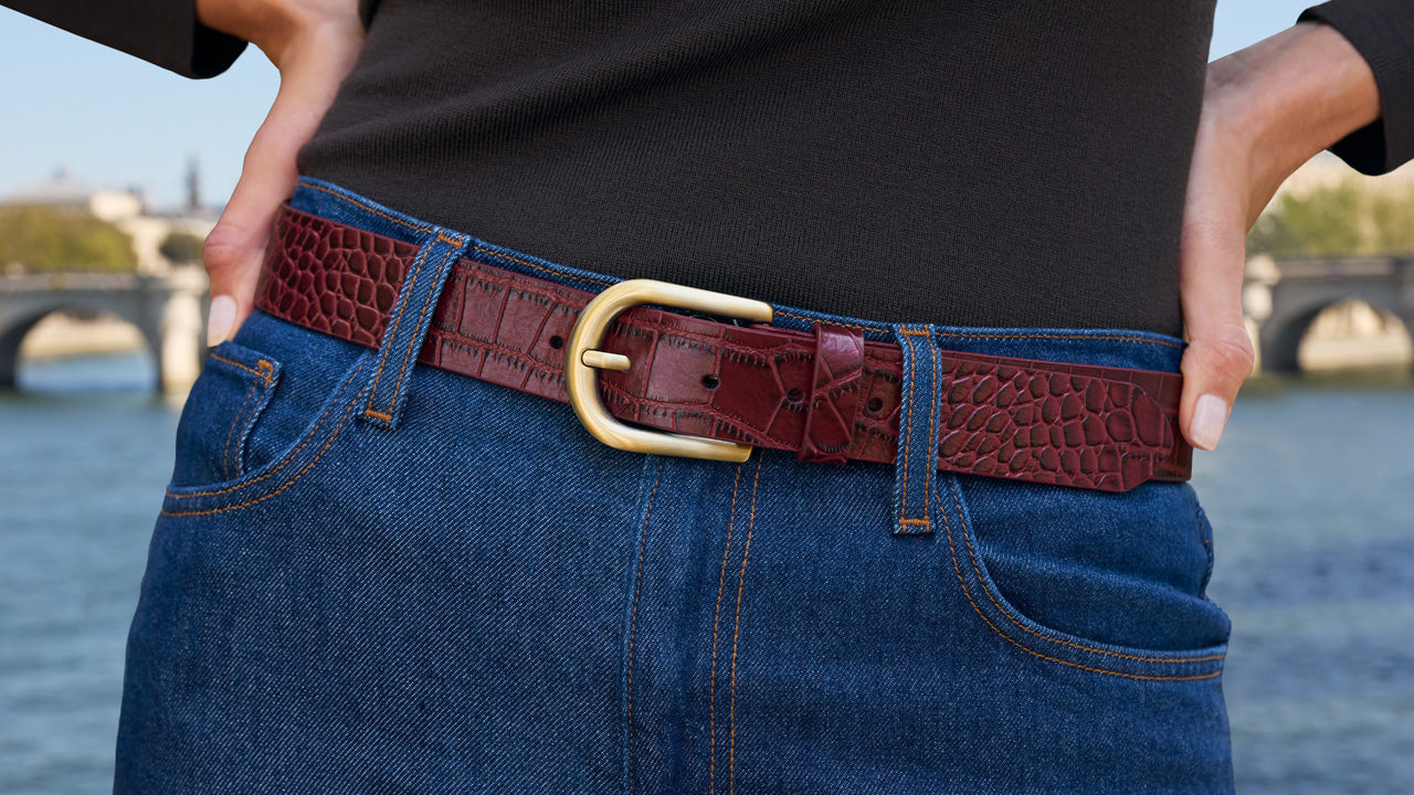Barni BeltVintage Distressed Croc Leather ‑ OxbloodOriginal price: $79.00Current price: $63.20This is a carousel with one large image and navigation arrows below. Select the previous slide or next slide buttons to change the main image. Click on the main image to navigate to the the product detail page. Click on the "Quick Shop" button to open the quickshop modal.