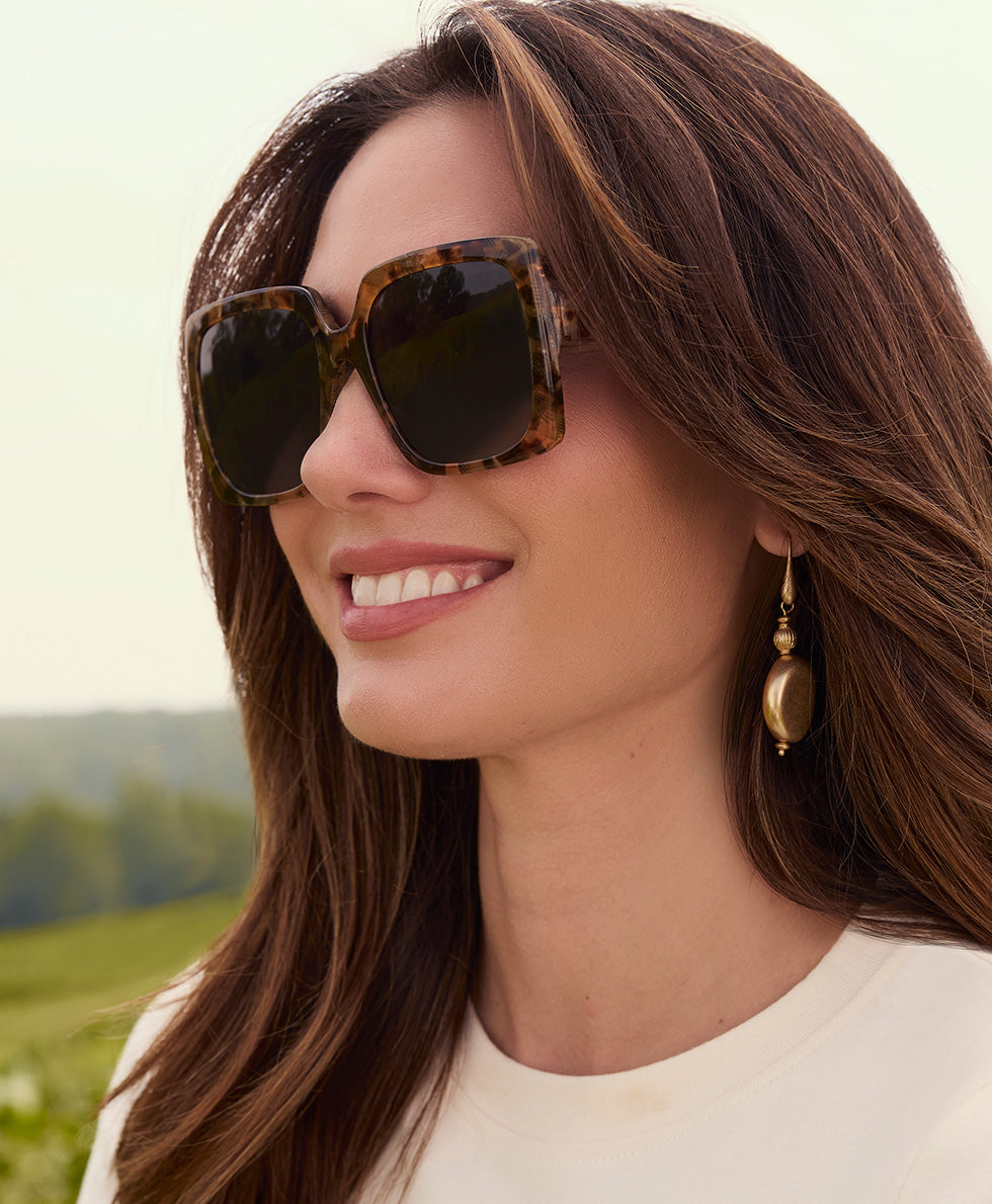 Current price: $79.00Color | TortoiseDare to go big with our Jackie Sunglasses. Named for the style maven, Jackie Kennedy Onassis, the clean lines, bold shape, and wide temple arms give undeniable class to these comfortable frames. The inside temple arms showcase our floret grape leaf logo design. This modern take on classic square frames with their flattering oversized shape ensures your high fashion IQ is noticed.