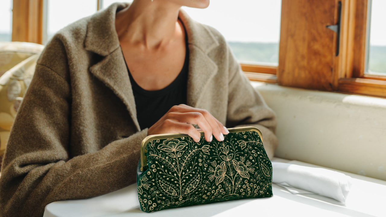 Current price: $149.00Color | BlackThis frame crossbody has an appealing profile made even more beautiful in Rico Embellished Velvet. Featuring a uniquely shaped kiss-lock closure, this elegant silhouette effortlessly complements everything from casual jeans to sophisticated outfits. Designed with versatility in mind, it includes two removable straps: a chain top handle for a touch of bling and an adjustable crossbody strap for hands-free convenience. As one of Patricia’s newest frame designs, the Evangeline is sure to elevate any look with its timeless beauty.