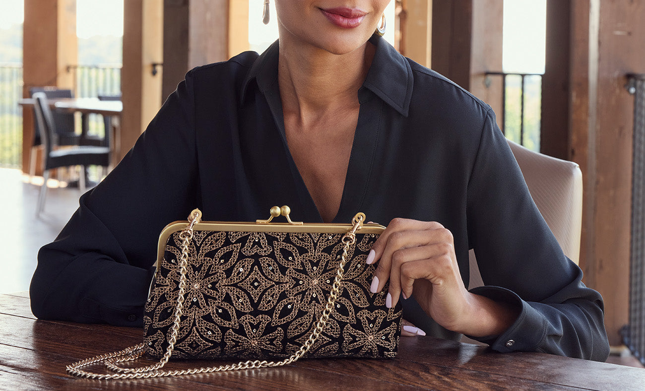 Current price: $149.00Color | BlackView Full DetailsThis frame crossbody has an appealing profile made even more beautiful in Rico Embellished Velvet. Featuring a uniquely shaped kiss-lock closure, this elegant silhouette effortlessly complements everything from casual jeans to sophisticated outfits. Designed with versatility in mind, it includes two removable straps: a chain top handle for a touch of bling and an adjustable crossbody strap for hands-free convenience. As one of Patricia’s newest frame designs, the Evangeline is sure to elevate any look with its timeless beauty.