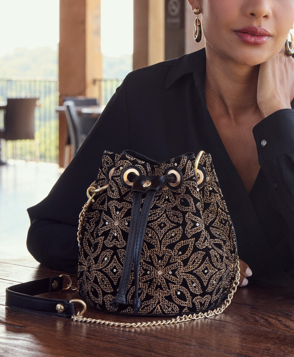 Current price: $169.00Color | GoldShow your love for vintage fashion with the Volania Drawstring Bag. Crafted in elegant Naoko Velvet, the creative details of this bag ensure it will be an instant classic. Whimsical and totally lovely, it has a round shape, an edgy chain strap that is detachable, as well as a generously sized, detachable top handle. The Volania gives you stylish options.