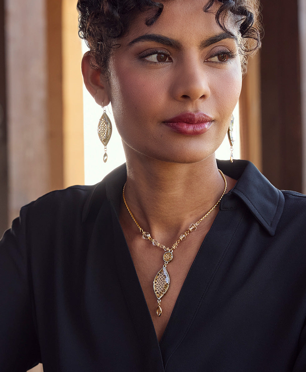 Current price: $49.00Color | Matte Gold/Matte RhodiumView Full DetailsEye-catching and elegant, this necklace features a large marquise pendant with a filigree center. A just-right touch to add color to any outfit, from casual to dressy, it features a unique sliding closure that allows you to adjust its length.