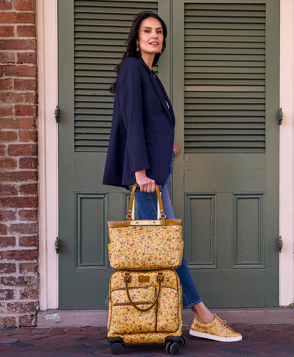 Current price: $249.00Color | Fleur de JardinView Full DetailsYour new favorite travel companion has arrived. The Mattia, featured in our striking Fleur de Jardin print, blends charm, function, and effortless style. With its unique shape and twisted rope leather handles, it brings a touch of nautical elegance to every journey. Designed with outstanding organization in mind, it includes 360-degree, multi-directional 4-wheel spinners for smooth and easy maneuvering, along with convenient interior and exterior pockets to keep everything in its place. The retractable metal telescopic handle tucks away neatly when not in use, while the twin twisted rope leather top handles offer a comfortable, stylish carrying option. A built-in panel on the back lets you attach it securely to the handle of another bag, making airport transitions seamless. Carry-on compliant, it is compact enough to stash under most airline seats making the Mattia the perfect companion for everything from quick getaways to weekend road trips.