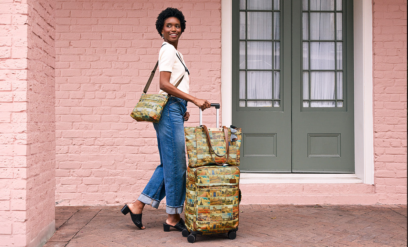 Current price: $249.00Color | Postcards From ParisView Full DetailsYour new favorite travel companion has arrived. The Mattia, featured in our striking Postcards From Paris print, blends charm, function, and effortless style. With its unique shape and twisted rope leather handles, it brings a touch of nautical elegance to every journey. Designed with outstanding organization in mind, it includes 360-degree, multi-directional 4-wheel spinners for smooth and easy maneuvering, along with convenient interior and exterior pockets to keep everything in its place. The retractable metal telescopic handle tucks away neatly when not in use, while the twin twisted rope leather top handles offer a comfortable, stylish carrying option. A built-in panel on the back lets you attach it securely to the handle of another bag, making airport transitions seamless. Carry-on compliant, it is compact enough to stash under most airline seats making the Mattia the perfect companion for everything from quick getaways to weekend road trips.
