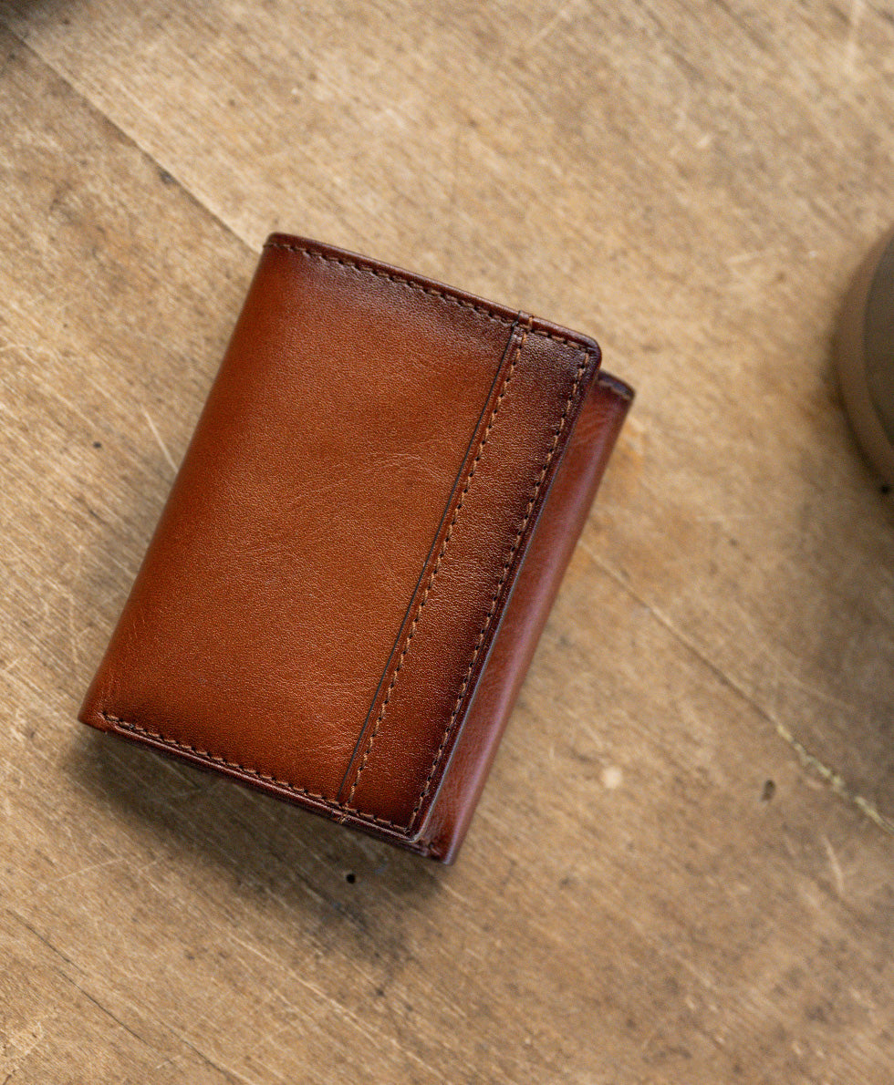 Color | ChestnutView Full DetailsThis compact, classically stylish trifold wallet is the perfect blend of organization, durability, and timeless design. Crafted to age handsomely with wear, it provides just the right amount of room for essentials. The sophisticated saddle stitching and finely scored edges add a touch of craftsmanship, ensuring that this wallet not only functions beautifully but also looks elegant as it develops character over time. A refined, durable choice, it has excellent form and function.