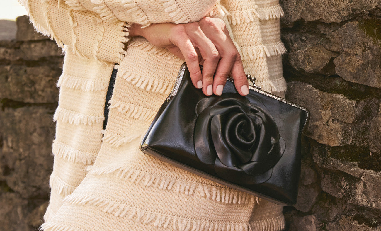 Current price: $249.00Excluded from SaleColor | CognacView Full DetailsLove your look with this frame bag that embodies of vintage flair and modern design. Crafted from full-grain leather, its convenient size and structured silhouette make it elegant and eye-catching. The classic kiss-lock closure adorned with delicate rosebud clasps offers a romantic, nostalgic touch while keeping your essentials secure. Whether you're dressing up or adding flair to everyday wear, this timeless piece carries it all in unmistakable style.