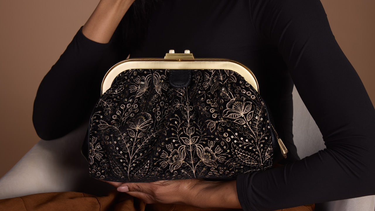 Current price: $111.75Original price: $149.0025% Off *Price as markedColor | BlackView Full DetailsThis frame crossbody has an appealing profile made even more beautiful in Rico Embellished Velvet. Featuring a uniquely shaped kiss-lock closure, this elegant silhouette effortlessly complements everything from casual jeans to sophisticated outfits. Designed with versatility in mind, it includes two removable straps: a chain top handle for a touch of bling and an adjustable crossbody strap for hands-free convenience. As one of Patricia’s newest frame designs, the Evangeline is sure to elevate any look with its timeless beauty.