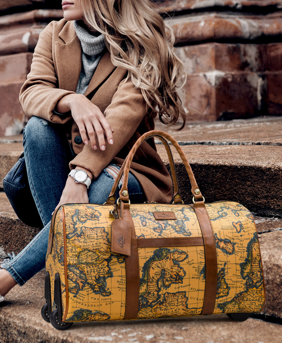 Avola Wheeled Duffel Bag Patina Coated Linen Canvas — European Map Print