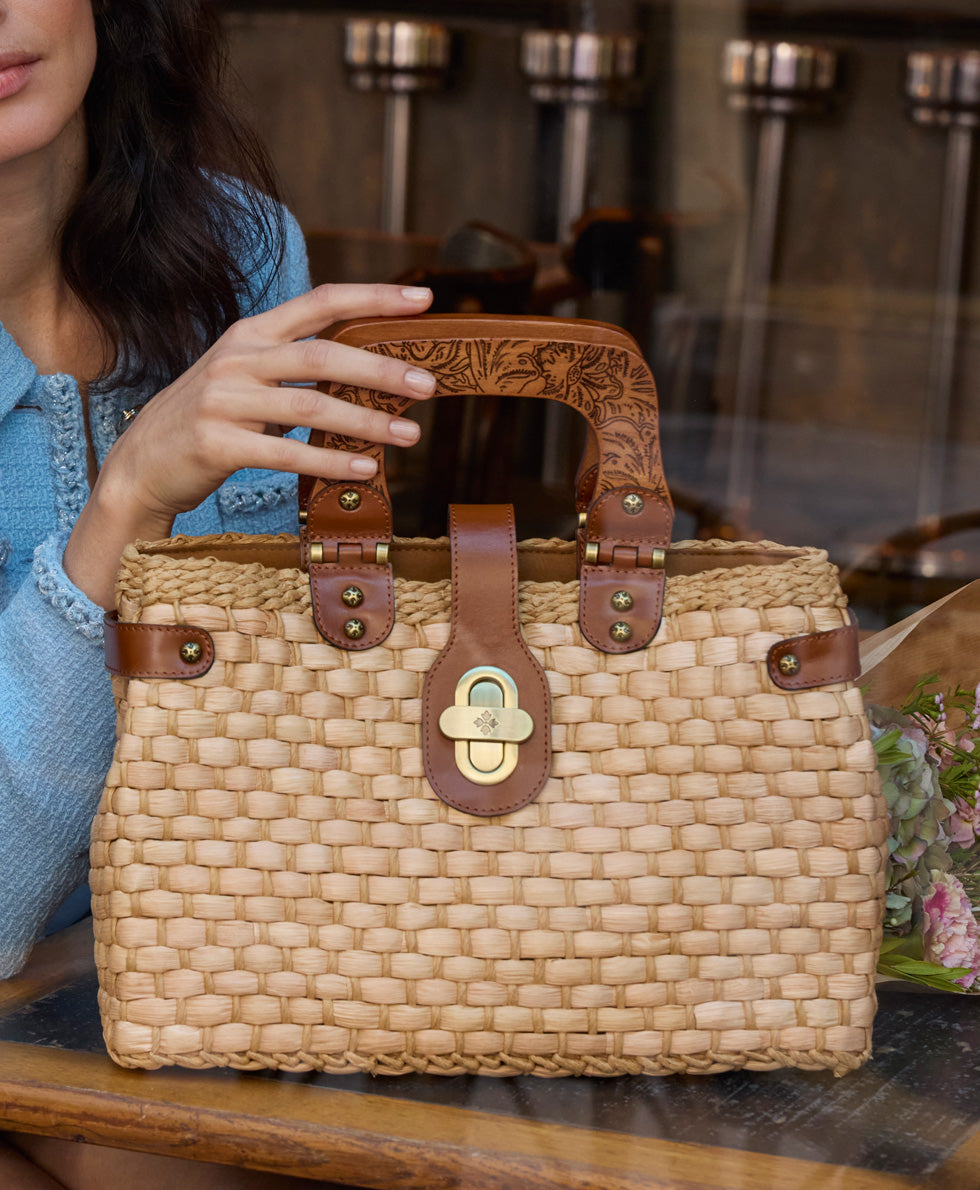 Current price: $229.00Color | Natural/TanView Full DetailsIn Vintage Distressed Woven Leather, the Sancia has eye-catching wood handles and supple leather trim. A true statement piece, it combines elegance and charm, bringing a touch of vintage glamour to your wardrobe. Carry it with confidence. It is effortless, chic, and always in style.