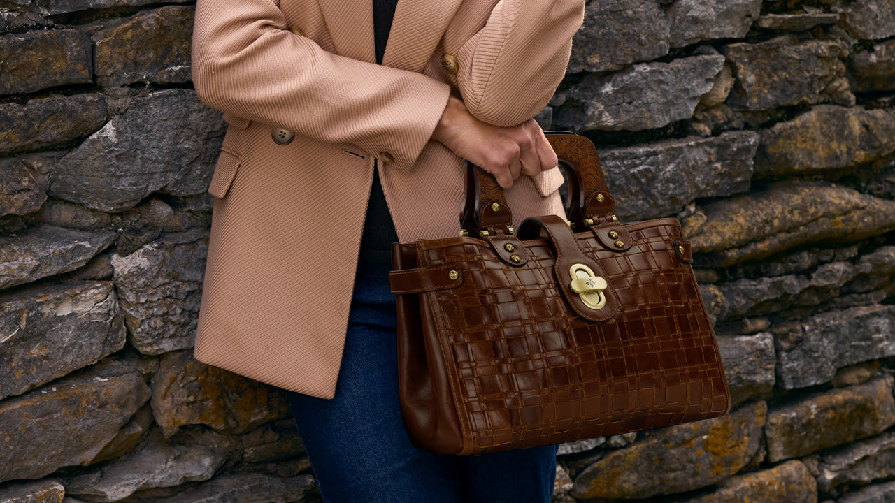 Color | CognacView Full DetailsIn Vintage Distressed Woven Leather, the Sancia has eye-catching wood handles and supple leather trim. A true statement piece, it combines elegance and charm, bringing a touch of vintage glamour to your wardrobe. Carry it with confidence. It is effortless, chic, and always in style.