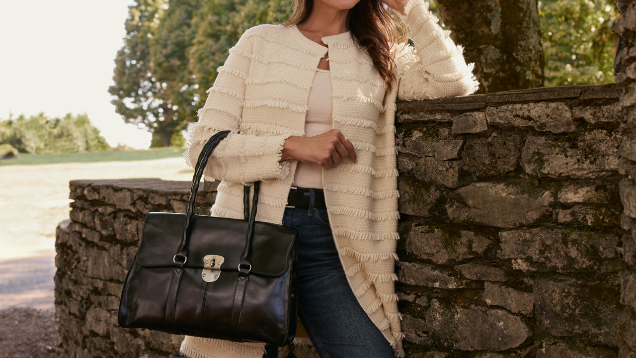 Color | BlackView Full DetailsSure to ring all the right bells, the Empoli Satchel combines striking round metal handles with a timeless, classic shape. Its crafted in iconic Heritage Leather, making it a standout piece in your wardrobe. Perfect for any outing, its versatile design allows you to carry it by the elegant handles for a chic look or switch to the detachable/adjustable crossbody strap for hands-free convenience. Whether dressing up or keeping it casual, the Empoli Satchel adds a touch of sophistication to every ensemble.