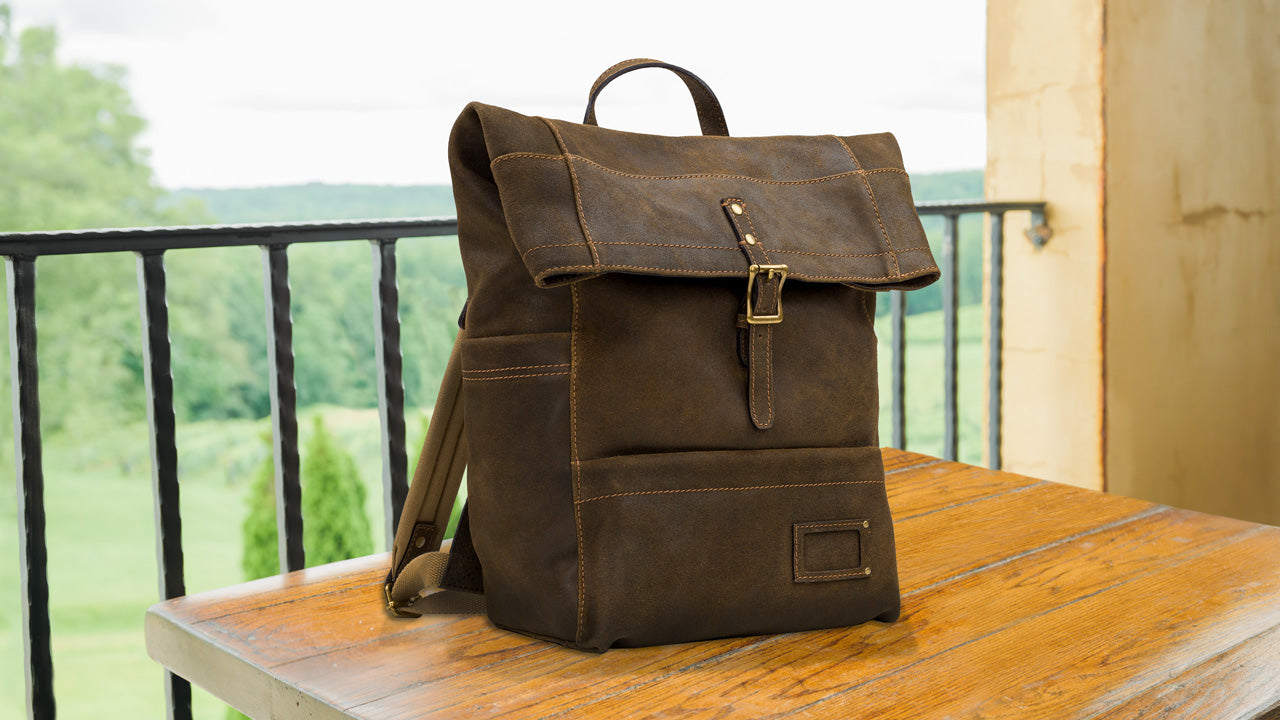Current price: $248.00Color | BrownView Full DetailsNatural variations in the handsome Moto Leather make our courier-inspired backpack both functional and stylish. The zip-top, classic fold over flap is fastened with an antique brass finished center bar buckle that keeps your belongings organized and secure. A front zip pocket stows away the essentials and sports a luggage tag inspired leather patch detail that is accented with antique brass finished rivets. This smart bag holds all of your gear and is a great alternative to a larger bag, perfect for commuters or those on the go with a mobile office. The back panel and shoulder straps are stitched and padded for comfort and crafted in 100% cotton canvas. This modern take on a classic design definitely displays your style.