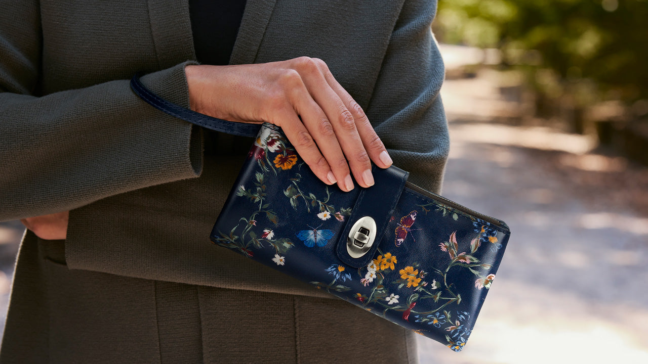 Current price: $129.00Color | Butterfly GardensView Full DetailsThis classically styled wallet features our stunning new Butterfly Gardens print and expert artisanal craftsmanship. It includes multiple card slots and note compartments, along with a clear ID window. Hidden magnets secure it in addition to a pretty twist-lock closure. It has a wristlet strap that can be retracted when you don't need it.