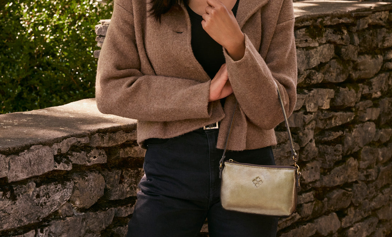 Current price: $99.00Color | Venice Postcard TanView Full DetailsThe Corinna is crafted in luxurious leather and boasts the print of a vintage postcard of Venice. his gorgeous accessory is a sleek companion for any ensemble and just the right size to carry essentials without weighing you down. Plus, the wrist strap makes it easy to grab and go.